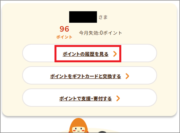 「ポイントの履歴を見る」より「支援・寄付」「獲得」「交換」をご確認いただけます。