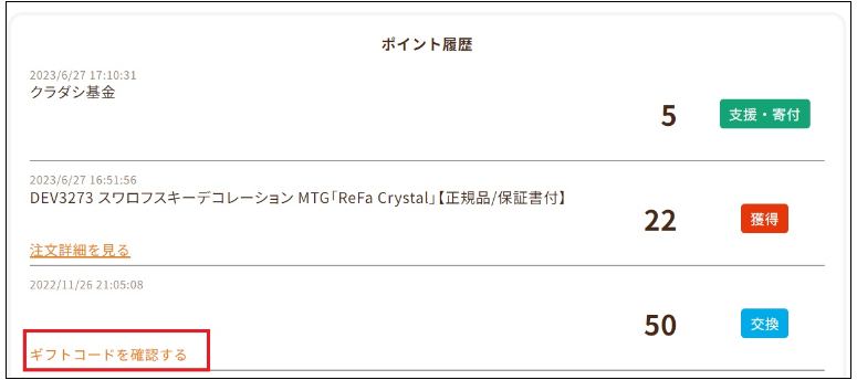 「ギフトカードに交換した際に送信されているメール」、または「マイページのポイント履歴」からご確認いただけます。