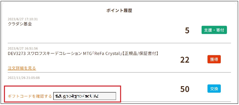 ギフトカードへの交換は「交換」履歴で詳細を確認できます。 「ギフトコードを確認する」を押下するとコードを確認できます。