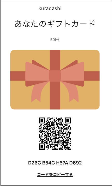 件名が「Kuradashiの¥●●のギフトカード」のメールよりご確認いただけます。
