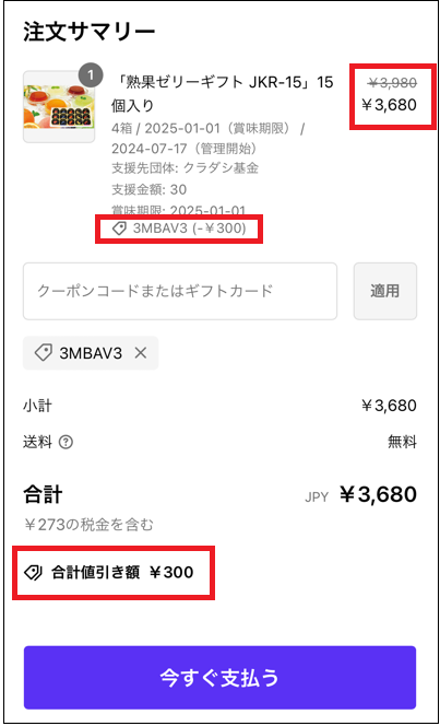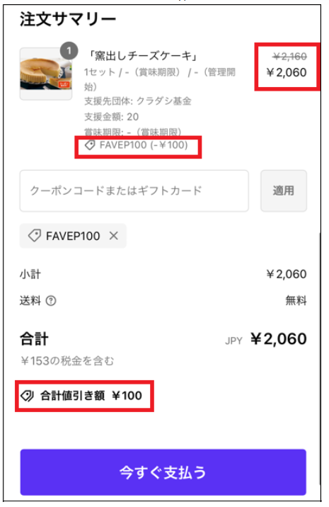 購入手続きを押下した後の注文サマリー画面にて以下のように割引金額が表示されますので、正しく適用されているか確認します。 反映済みの場合、支払い画面へ進みます。