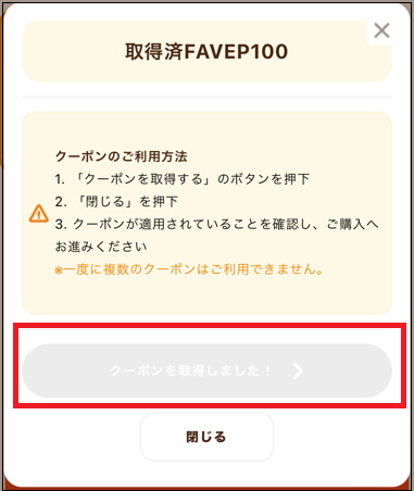 「クーポンを取得する」を押下し、オレンジからグレーになるのを確認します。