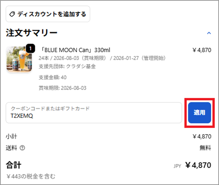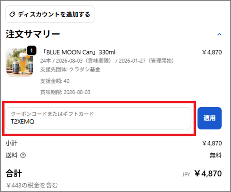 ご注文の決済画面に「クーポンコードまたはギフトカード」欄にご利用予定のギフトコードを入力する