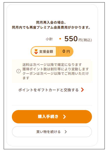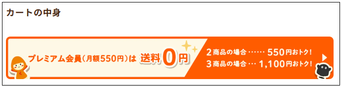 カート内より「プレミアム会員(月額550円)は送料0円」のバナーを押下ください。