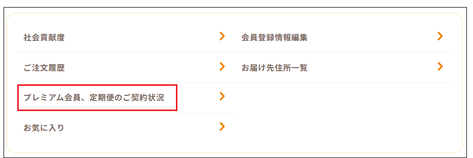 マイページ内の「プレミアム会員、定期便のご契約状況」にアクセスします。