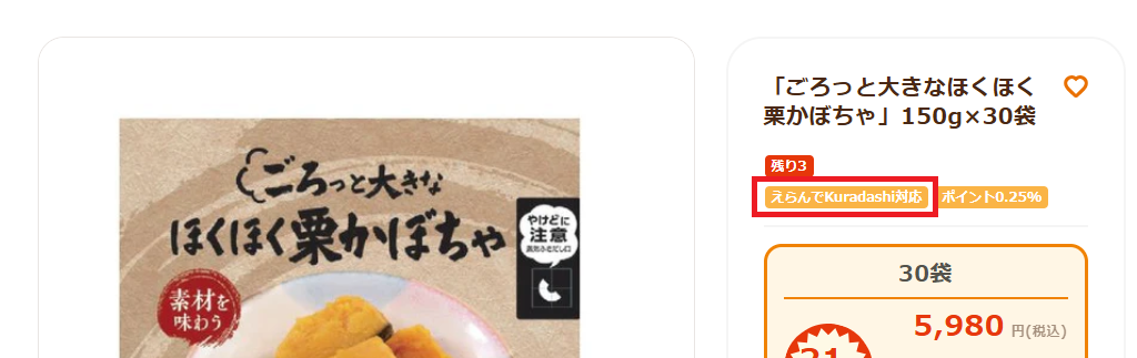 以下ページに掲載している商品に限ります。 ➡️えらんでKuradashi ~自分で作る!フードロス削減BOX~また、通常の商品ページからもご確認いただけます。以下【えらんでKuradashi対応】のラベルが付いている商品が対象となります。
