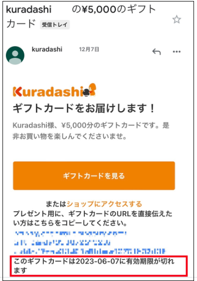 ➡️メールの件名:kuradashiの¥●●のギフトカード