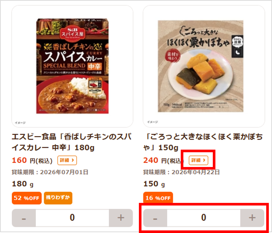 各商品の「+」「-」ボタンで個数を変更、または「0」の箇所に直接数をご入力ください。