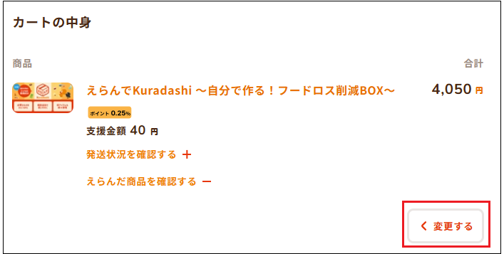 カート画面から商品ページに戻りたい場合にはカート内の「変更する」ボタンを押下ください。