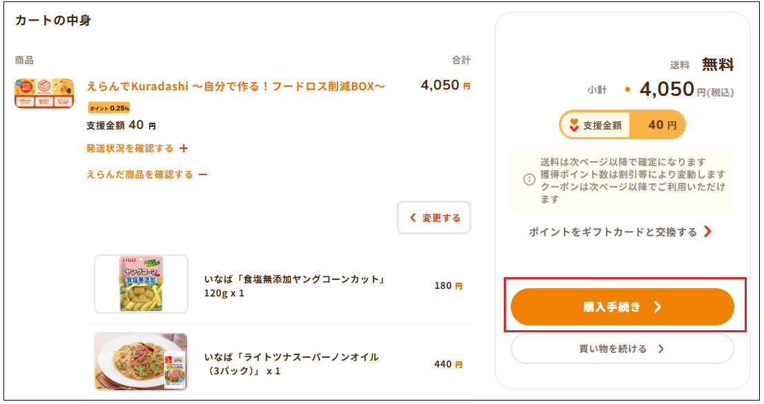 「カートの中身」画面で選んだ商品をご確認いただけます。