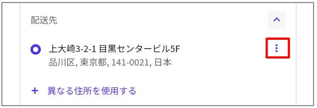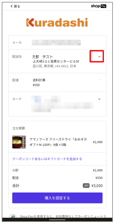 購入カート画面で「配送先」の下向き矢印マークを押します。