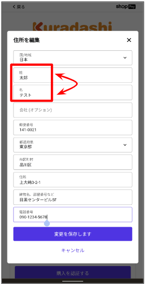 Shop Pay経由でご注文いただいている場合、Kuradashiのアカウント情報とは別で決済情報・配送先情報等が保有されているため、Shop Pay内で姓名が逆の状態で保存されている可能性があります。