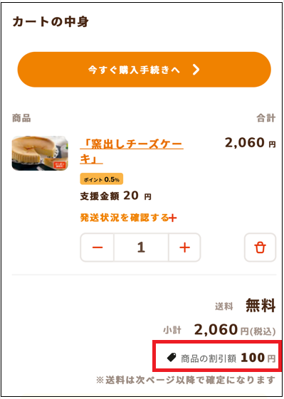 カートの中身にて「商品の割引額」で割引が反映されている事をご確認ください。